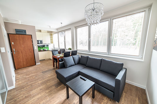Apartament znajduje się na pierwszym piętrze i składa się z części salonowej z eleganckim i w pełni wyposażonym aneksem kuchennym, sypialni oddzielonej od salonu oryginalnymi przesuwanymi drzwiami oraz łazienki. W apartamencie mogą komfortowo nocować cztery osoby, wygodna, obszerna sofa w salonie jest rozkładana, a w sypialni znajduje duże łoże małżeńskie z miękkim zagłówkiem.